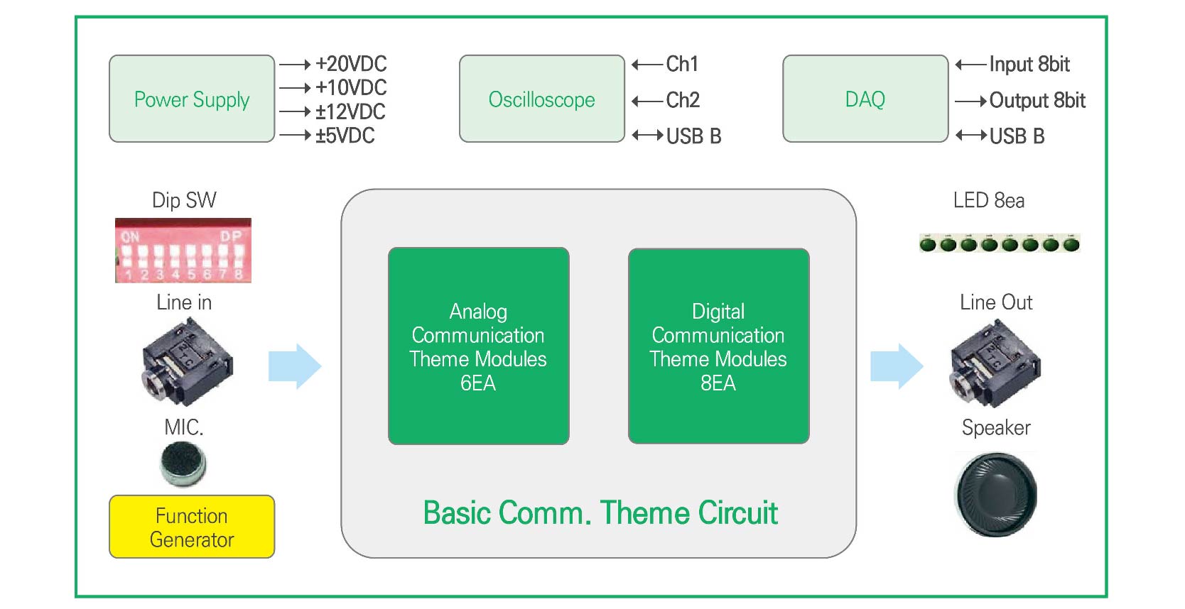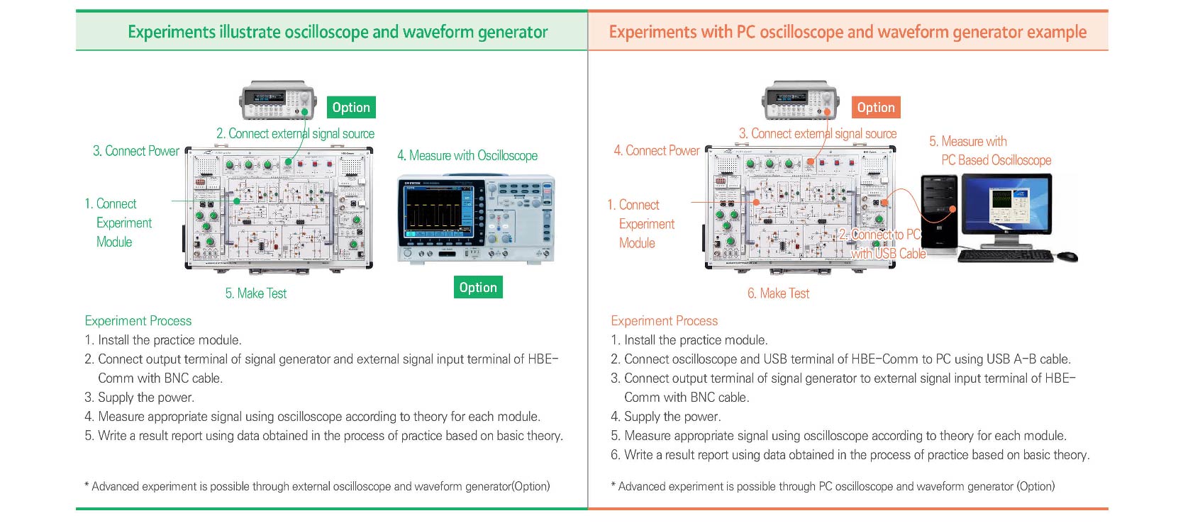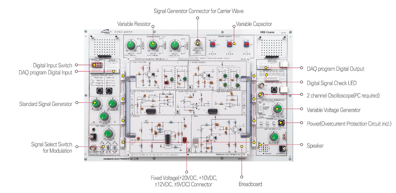 For basic communication, we can understand Signal Generator, Frequency Multiplier, and Filter and then we can know the basic circuit of Analog Communication and Digital Communication. This is the basic Education Theme of Communication Engineering used in Educational Field for a long time. HBE-Comm arranges the basic circuit as drawn on Circuit Diagram to understand it easily, and this uses generates Carrier Signal with Waveform Generator and inputs it to the circuit and also uses Oscilloscope to see