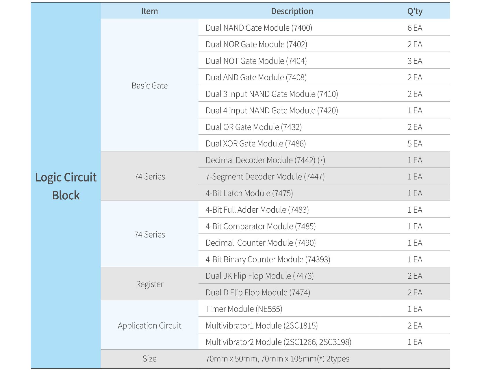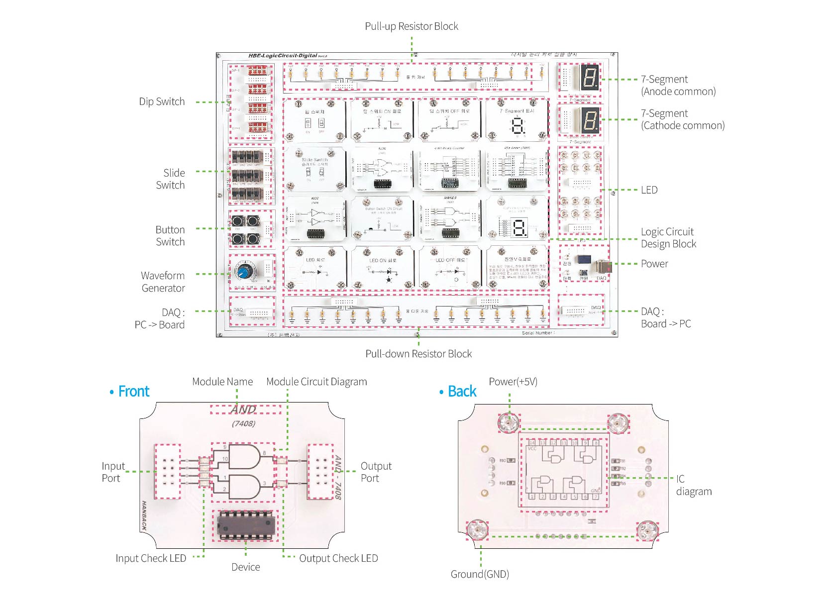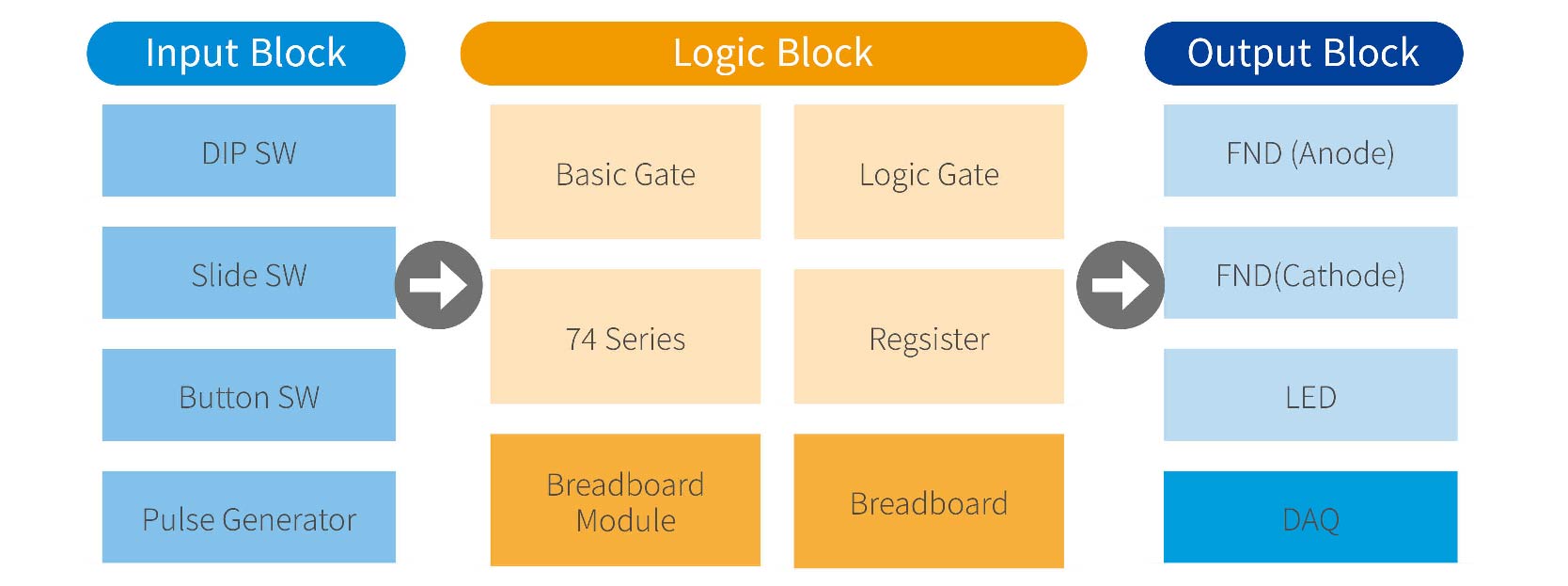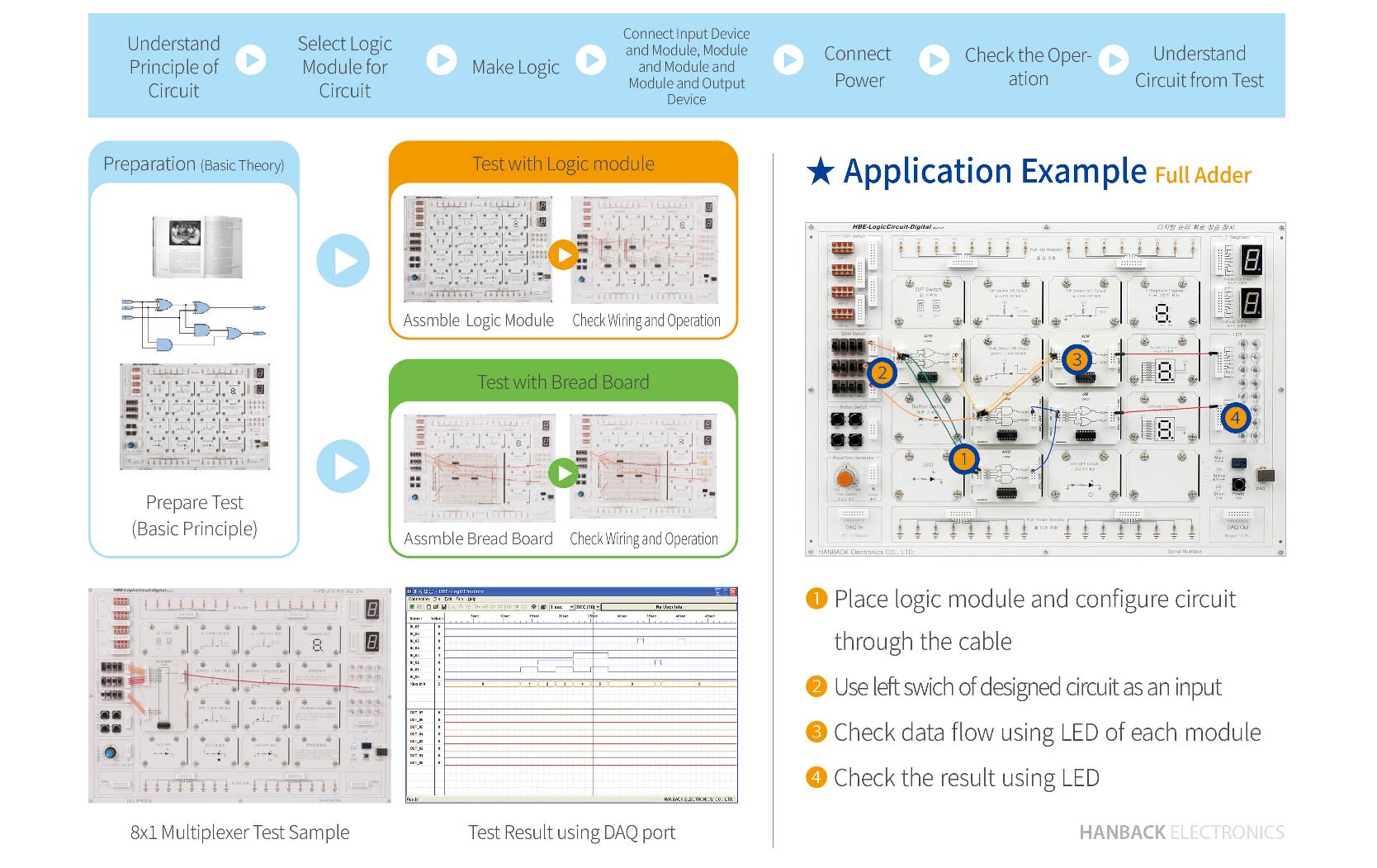 Recently as Society has been changed from knowledge based to Technology combined Knowledge economy, Education Paradigm is changing, and new Education goal is on the rise, Development of Positive Problem Solving Skill. HBE-LogicCircuit Digital is Students based Platform for intuitive test, which they can test Digital Logic Circuit, a required subject for vocational training in secondary education(specialized course), for with interest. HBE-LogicCircuit Digital is composed of basic gate, logic gate, 74 series and register for digital logic circuit test. And we can do application test using Bread Board and Universal module with it.