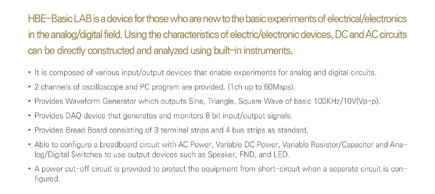 HBE-Basic LAB Catalogue AnalogㆍDigital Training Equipment Hardware Specifications Training Contents Layout Components