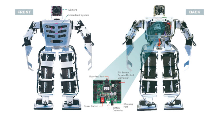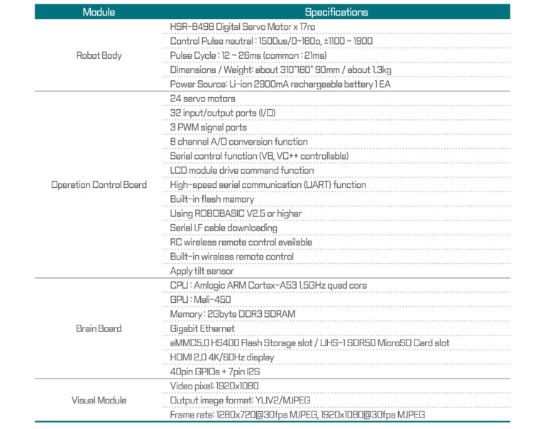 HBE-ROBONOVA AI 3 is an intelligent 16-joint biped robot with an MR-C3024 controller board capable of controlling 32 servo motors simultaneously and an Amlogic embedded processor for high-resolution image acquisition, image processing and intelligence algorithms.