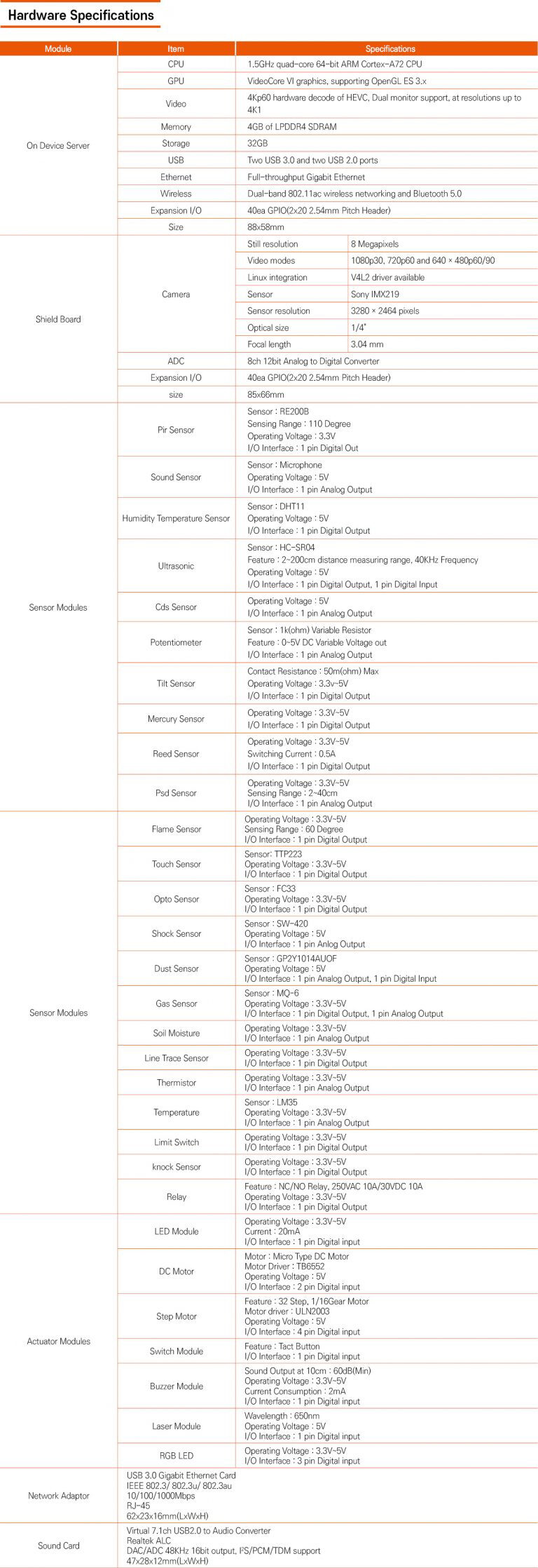 AIoT Server Plus Catalogue Product Features Module-to-module cabling makes AI and IoT application practice equipment easier to useConsists of ARM Cortex-A72 quad-core processor module, dedicated shield and IoT sensor module2.54mm jumper cables and 30 IoT sensor modules enable a variety of real-world ideasProvides 8M pixel high resolution camera for image processing applicationsProvides Gigabit Ethernet, dual band Wi-Fi (2.4GHz, 5GHz) and Bluetooth 5.0Headsets support cloud-based speech recognition and audio playbackTensor processor unit module can be added as an optionSoda OS, the exclusive AIoT operating system, and Pop libraryInterpreter-based C/C++ development environment optimized for beginners in programming, including Python 3Dedicated web browser-based learning environment for learning Python 3 and C/C++ simultaneously on PCs and tabletsmDNS/DNS-SD based distributed name resolution and network service publishing and discoveryIntegrated development environment based on Visual Studio Code for professional application developmentIoT sensor control and multimedia, AI learning contents Software Specifications Hardware Specifications Advantages of AIoT Server Plus Training Contents Product Configuration