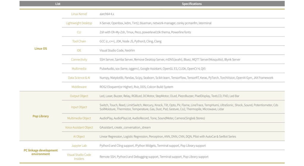 SerBot AGV Catalogue 제품 특징 클러스터 컴퓨팅 기반 인공지능(인지/판단)유닛과 고성능 MCU 기반 운영제어유닛으로 구성된 딥러닝 기반 실내용 서비스로봇 개발 플랫폼인공지능유닛은 로봇운영체제(ROS2) 환경에서 고성능 딥러닝 모델 개발 및 운영이 가능하도록 온-보드 상에서 1~4개의 산업용 고성능 NVIDIA 엣지 슈퍼컴퓨팅 모듈을 Gigabit 스위치로 묶은 컴퓨터 클러스터로 구성인공지능유닛은 무인이동체의 운영제어가 가능하도록 Gigabit Ethernet, 802.11ac Wi-Fi, Bluetooth, USB 3.0, USB OTG, CAN, I2C, SPI, GPIO 인터페이스 제공인공지능유닛과 CAN으로 연결되는 운영제어유닛은 무인이동체의 실시간 제어가 가능하도록 고성능 STM Cortex-M4 프로세서와 모터 드라이버 및 초음파 센서, 근접센서, Zigbee V3.0, CAN 트랜시버로 구성주변 상황을 인공지능으로 학습/운영하는 자율주행 서비스 구현을 위해 카메라와 고성능 360도 라이다 제공GUI 기반 지능형 서비스 로봇 인터페이스 구현을 위해 1080p 해상도의 11.6인치 터치 디스플레이 제공음성으로 서비스 로봇을 제어하고 서비스 로봇의 상태를 확인할 수 있도록 고성능 디지털 마이크와 스피커 제공서비스로봇의 장애물 감지 및 자율주행 보조를 위해 초음파 센서와 PSD 센서 및 주행거리 계산이 가능하도록 엔코더가 포함된 DC 모터 제공PC, 스마트폰, 태블릿 등을 통해 서비스로봇의 원격 제어가 가능하도록 Wi-Fi 및 블루투스 통신을 제공하며, 군집 주행 및 서비스로봇 간 협업이 가능하도록 ZigBee V3.0 제공대용량 배터리 채택 및 효율적인 충전 시스템 도입으로 지속적인 실습 지원우분투 리눅스를 로봇운영체제(ROS2)와 CUDA 기반 딥러닝 프레임워크에 맞춰 최적화한 Soda OS로 운영되므로 사용자가 해당 라이브러리 및 프레임워크를 설치하고 설정하는데 소요되는 시간 최소화전문적인 응용 개발을 위해 Visual Studio Code 기반 공개용 통합개발환경 지원딥러닝 기반 서비스로봇 학습 모델과 실습 컨텐츠 제공 운영프로그램 하드웨어 사양 교육내용 Layout 제품 구성품