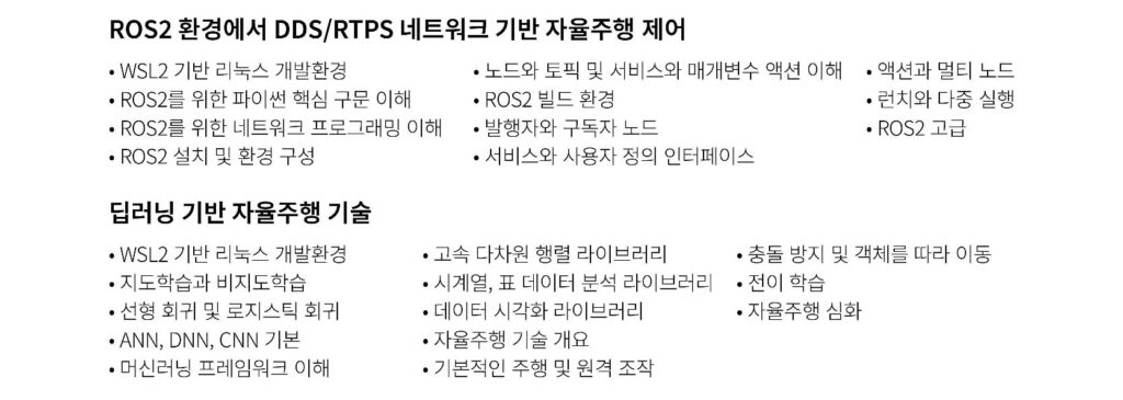 SerBot II Catalogue 제품 특징 실내용 서비스로봇 플랫폼 기반 AI 응용 실습 장비두뇌 보드는 NVIDIA 고성능 온-디바이스 AI 플랫폼 채택GUI 기반 사용자 인터페이스와 딥러닝을 위해 터치 디스플레이와 고해상도 광각 카메라 제공기가비트 이더넷과 듀얼 밴드 Wi-Fi 및 블루투스 제공디지털 마이크 및 스피커를 통해 음성 인식 및 오디오 재생 지원4개의 전용 확장 인터페이스를 통해 다양한 IoT 센서 모듈 지원구동부는 3축 옴니휠을 채택해 로봇의 이동 효율성 극대화 및 회전반경 최소화구동부의 정밀 제어를 위해 고성능 MCU가 답재된 제어기로 옴니휠 모터와 인코더 및 센서 제어두뇌 보드와 제어기의 협업을 위해 신뢰성 높은 CAN FD 통신으로 연결배터리 충전 중에도 실습을 지속할 수 있도록 파워 경로 관리 회로 내장로봇 표준 미들웨어인 ROS2를 통해 서비스로봇 개발 지원응용 구현에 집중할 수 있도록 고수준 Pop 라이브러리 제공CUDA 기반 PyTorch 및 Tensorflow 인공지능 프레임워크 지원웹브라우저 기반 구글 블록 코딩 플랫폼(Blockly) 지원전문적인 응용 개발을 위해 Visual Studio Code 기반 사전 설정된 통합개발환경 지원딥러닝 기반 서비스로봇 학습 컨텐츠 제공온-디바이스 AI 자율주행 실습 장비 운영 프로그램 하드웨어 사양 교육내용 Layout 구성품