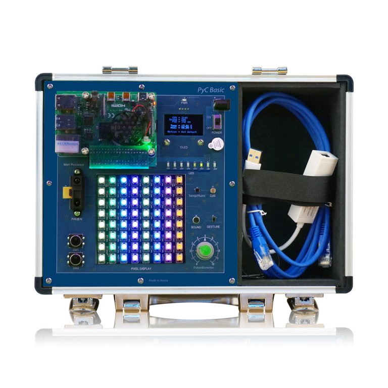PyC Basic Catalogue 제품 특징 데이터 사이언스 및 인공지능 학습을 위한 AIoT 프로그래밍 입문 장비고성능 ARM Cortex-A72 쿼드 코어 프로세서 모듈과 프로그래밍 학습에 최적화된 입출력 주변장치들을 하나의 보드로 구성기가비트 이더넷과 듀얼 밴드 Wi-Fi(2.4GHz, 5GHz) 및 블루투스 5.0 제공몰입감을 높이기 위해 OLED와 8×8 Pixel Display 및 Gesture Sensor 등 최신 주변장치 제공파이썬3를 비롯해 프로그래밍 입문에 최적화된 인터프리터 기반의 C/C++ 개발환경 지원AIoT 전용 운영체제인 Soda OS와 Pop 라이브러리 지원PC를 비롯해 태블릿 등에서 파이썬3와 C/C++를 동시에 학습할 수 있는 웹브라우저 기반 전용 학습 환경 지원mDNS/DNS-SD 기반 분산 이름 확인 및 네트워크 서비스 게시, 발견 지원전문적인 응용 개발을 위해 Visual Studio Code 기반 공개용 통합개발환경 지원데이터 사이언스 및 인공지능 구현에 필요한 프로그래밍 언어을 학습하는 전용 컨텐츠 제공 소프트웨어 사양 하드웨어 사양 교육내용 Layout 제품 구성품