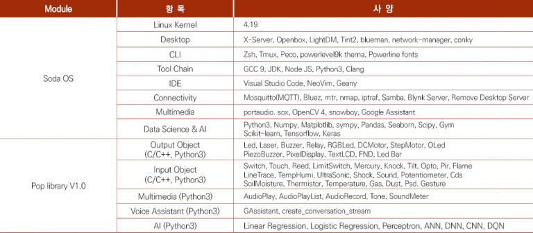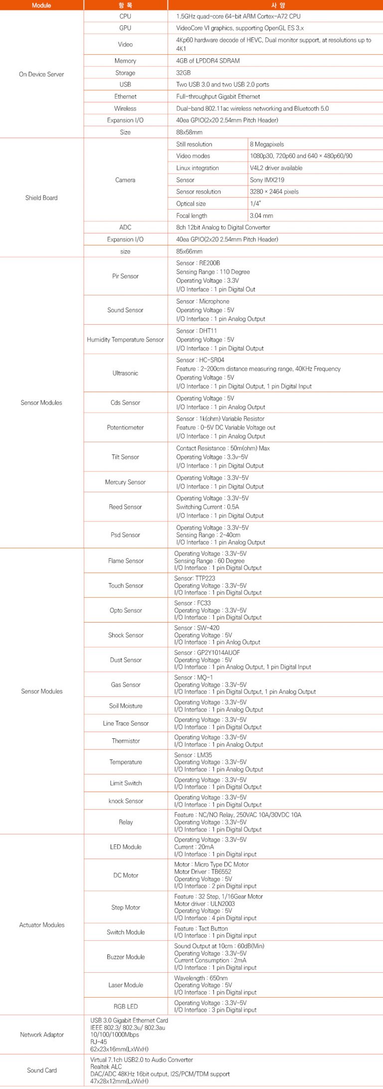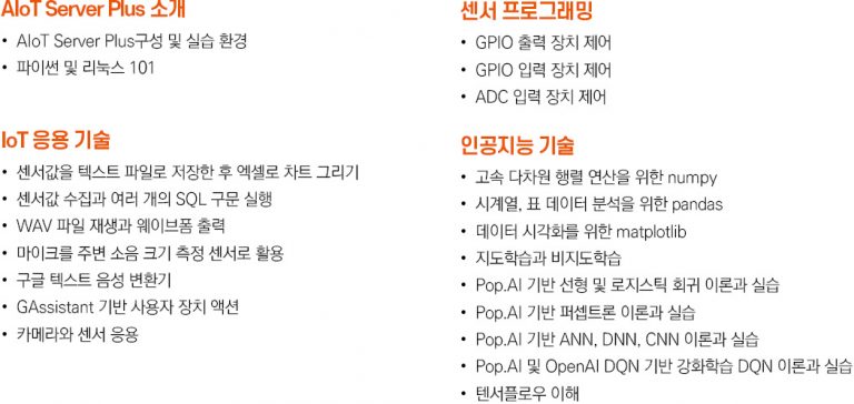 AIoT Server Plus Catalogue 제품 특징 모듈 간 케이블링으로 자유도를 높인 AI 및 IoT 응용 실습 장비ARM Cortex-A72 쿼드 코어 프로세서 모듈과 전용 쉴드 및 IoT 센서 모듈로 구성2.54mm 점퍼 케이블과 30종의 IoT 센서 모듈을 통해 다양한 실생활 아이디어 구현 가능영상처리 응용을 위해 8M 픽셀 고해상도 카메라 제공기가비트 이더넷과 듀얼 밴드 Wi-Fi(2.4GHz, 5GHz) 및 블루투스 5.0 제공헤드셋을 통해 클라우드 기반 음성 인식 및 오디오 재생 지원옵션으로 텐서 프로세서 유닛 모듈 추가 가능AIoT 전용 운영체제인 Soda OS와 Pop 라이브러리 지원파이썬3를 비롯해 프로그래밍 입문에 최적화된 인터프리터 기반의 C/C++ 개발환경 지원PC를 비롯해 태블릿 등에서 파이썬3와 C/C++를 동시에 학습할 수 있는 웹브라우저 기반 전용 학습 환경 지원mDNS/DNS-SD 기반 분산 이름 확인 및 네트워크 서비스 게시, 발견 지원전문적인 응용 개발을 위해 Visual Studio Code 기반 공개용 통합개발환경 지원IoT 센서 제어 및 멀티미디어, 인공지능 학습 컨텐츠 제공 소프트웨어 사양 하드웨어 사양 AIoT Server Plus만의 강점 교육내용 제품 구성품